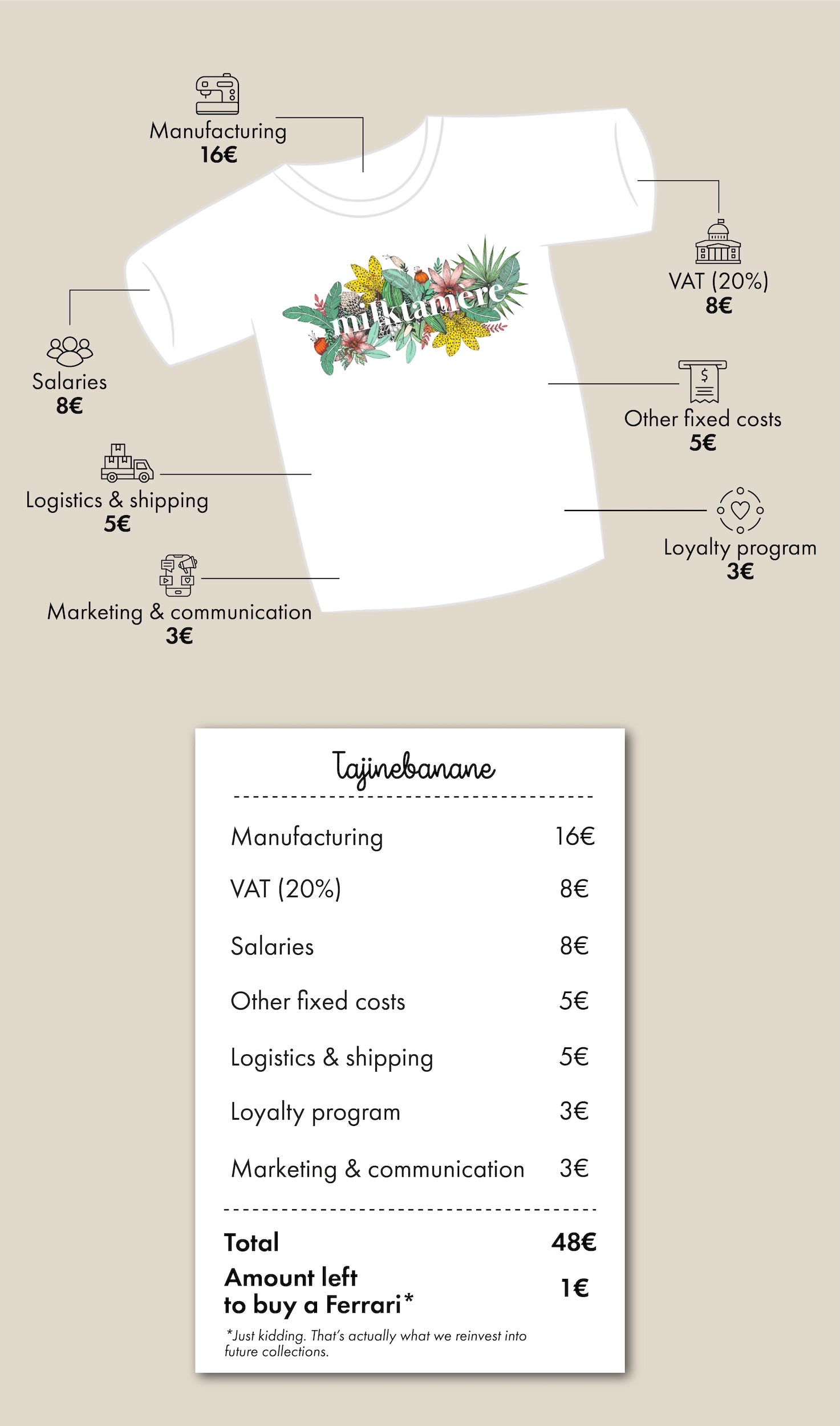 And because transparency is one of our core values, we’re showing you exactly how the price of a Tajinebanane T-shirt breaks down.